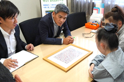 祭原良介さん、今西芽さんは鍵岡寛俊支店長、田中一成同金庫総合企画部部長へ作品を説明しました。