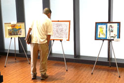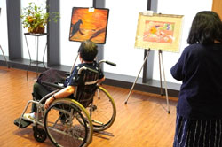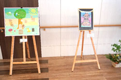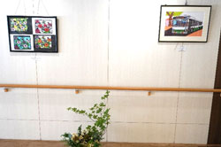 医大病院の廊下に個性豊かな作品がお花と一緒に展示され、ほんわかとした雰囲気をかもし出しています。患者さんや医療スタッフのみなさんが足を止め、しばし安らぎの時間を過ごされています。