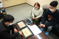 坂元陽介さんは作品を持参して、石戸順二南都銀行富雄支店長さんへ作品を説明しました。