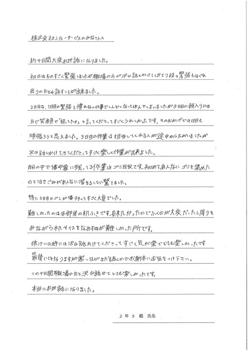 生徒は「ゴミ回収は多くて大変でした。トイレ清掃がよかったです」「実習は楽しくて、また来たいです」と話していました。