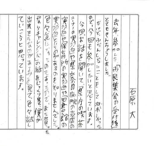 また、「市民集会の受付にいきたい」「奈良病院売店の実習にいきたい」等生徒たちの話をみんなで共有でき、元気な講習会となりました。