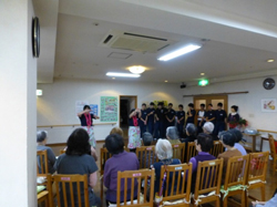 生徒たちは、みなさんに喜んでもらおうと笑顔いっぱい!文化祭さながらに踊っていました。入居者の方々は、手拍子をしたり手を動かして一緒に踊ったりしてとても楽しんで見てくれました。