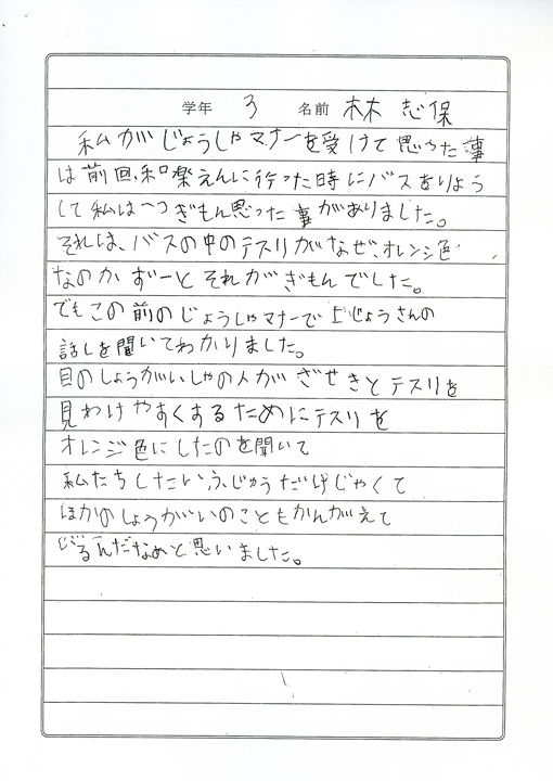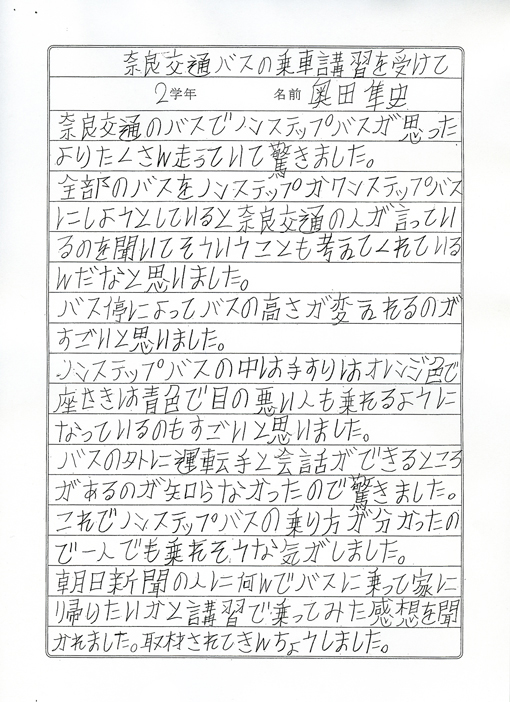 また、奈良交通(株)上條正幸さんの講話も生徒の心に響き、いい経験をたくさんして乗車講習は終了しました。 ありがとうございました。