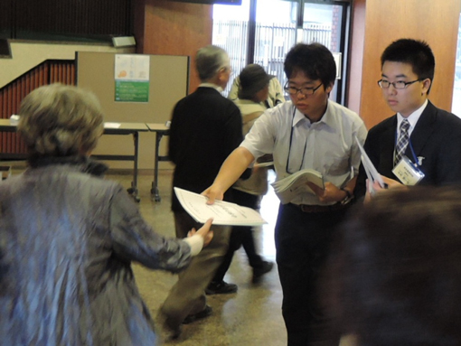 「こんにちは!」生徒たちは約500人のお客様へ元気よく挨拶をして、資料を手渡しさせていただきました。また、参加票の整理もさせていただきました。講座の開会に際し、司会者が生徒の受付係の紹介をしてくださいました。