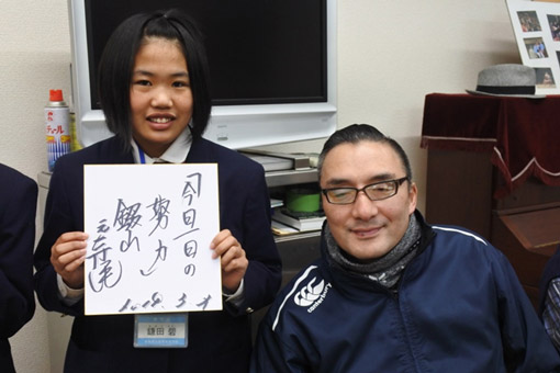 活動後、錣山親方(元関脇寺尾)からサインをいただき、生徒たちは大喜びです。