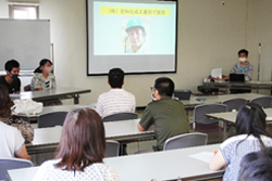 生徒・卒業生の若者会「ひまわり」は2カ月に1回、八木駅前の「すみれホール」に集まっています。8/22(日)、16名が集まり、大前章太さん(26歳、葛城市、高等養護学校卒)の報告を聞きました。