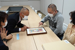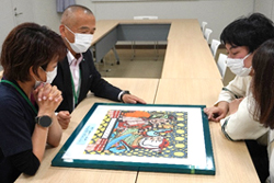北口拓巳さん、 今西芽さん、井上真介さんは作品を持参して岡眞啓事務局長、山本悦子看護副部長へ作品説明をしました。