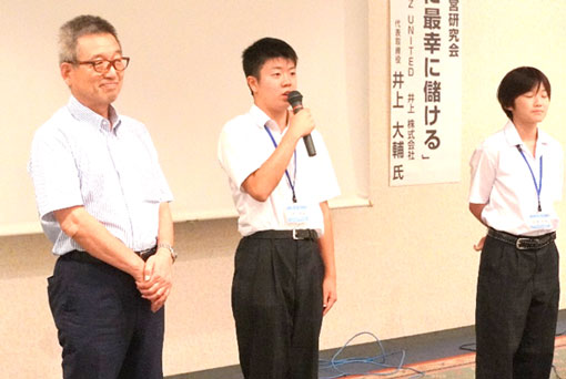 記念講演の冒頭、生徒たちは「始めは緊張して上手くできなかったけど、最後はできました。頑張りました」「初めての経験はいい学びになり、楽しかったです」と堂々と感想を話しました。参加者から大きな拍手をいただきました。