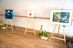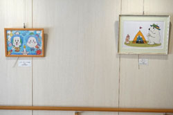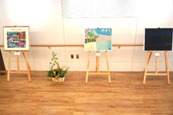 医大病院の廊下に個性豊かな作品がお花と一緒に展示され、ほんわかとした雰囲気をかもし出しています。患者さんや医療スタッフのみなさんが足を止め、しばし安らぎの時間を過ごされています。