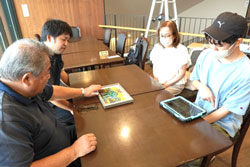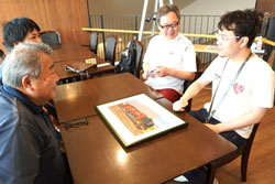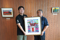 坂元陽介さん、祭原良介さん、北口拓巳さんは作品を持参して、川合信行道の駅長さん(奈良交通株式会社)へ作品説明をしました。