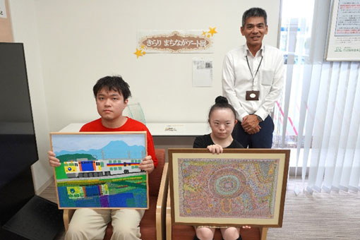 坂元陽介さん、祭原良介さん、北口拓巳さんは作品を持参して、川合信行道の駅長さん(奈良交通株式会社)へ作品説明をしました。