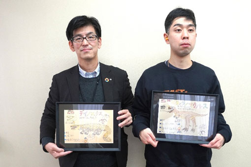 恐竜が大好きな坂元さんが「恐竜探検図鑑シリーズ」を見て描いた作品です。石戸支店長さんも恐竜が好きなので、話が盛り上がりました。