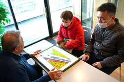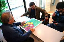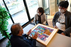 祭原良介さん、北口拓巳さん、吹井充は作品を持参して、川合信行道の駅長さん(奈良交通株式会社)へ作品説明をしました。