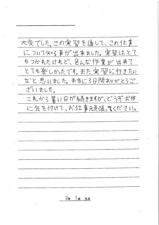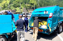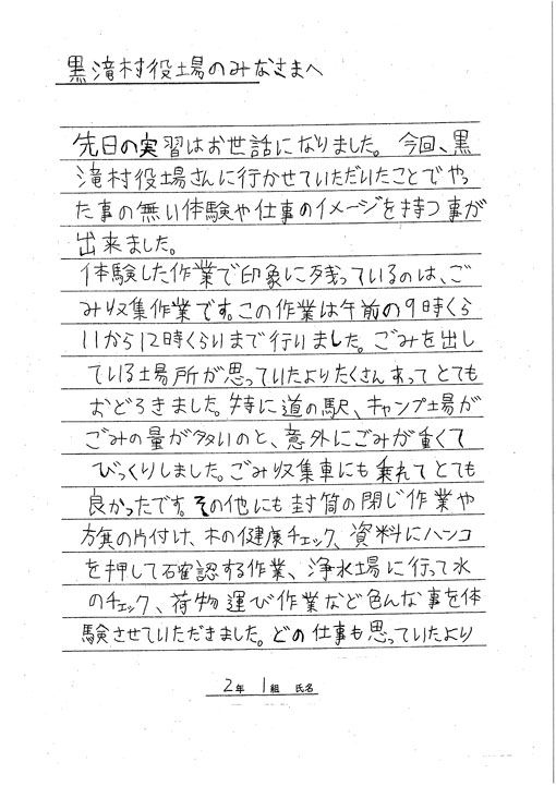 生徒はゴミ収集、クビアカツヤカミキリ調査、啓発のぼり撤収、水道施設清掃、書類封筒入れ等の作業を村職員さんと一緒にしました。「いろいろな作業を体験させていただき、楽しかったです」と生徒は笑顔で話していました。
